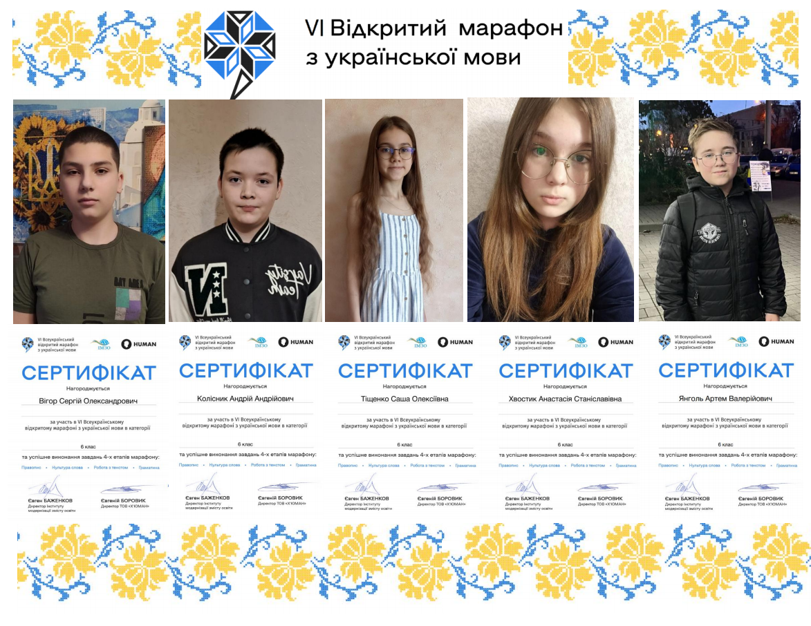📆Протягом чотирьох тижнів учні 6-А класу Вігор Сергій, Колісник Андрій, Тіщенко Олександра, Хвостик Анастасія і Янголь Артем із запалом та завзяттям долали випробування VI Відкритого марафону з української мови! Усі діти успішно впоралися з викликами і отримали заслужені сертифікати! 💯 Це свідчення їхньої дисциплінованості, глибоких знань та неабиякого прагнення до розвитку🏆.